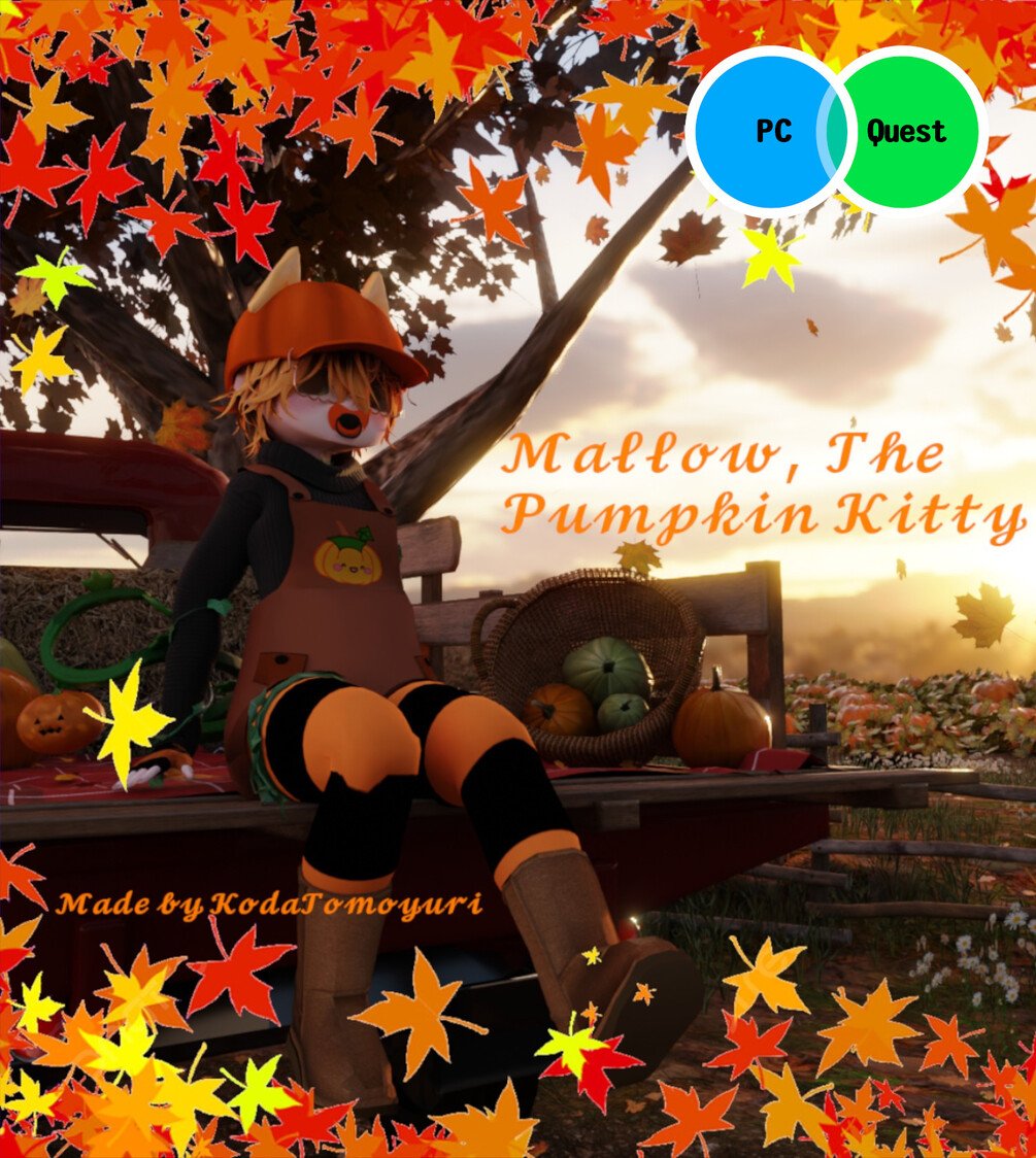 Sweet as pie and twice as spooky, Mallow is a pumpkin-themed chibi cat avatar overflowing with autumn charm. Perfect for fall vibes, cozy gatherings, or Halloween parties in VRChat, Mallow blends cuteness with a sprinkle of mischiefโjust like any good cat should.